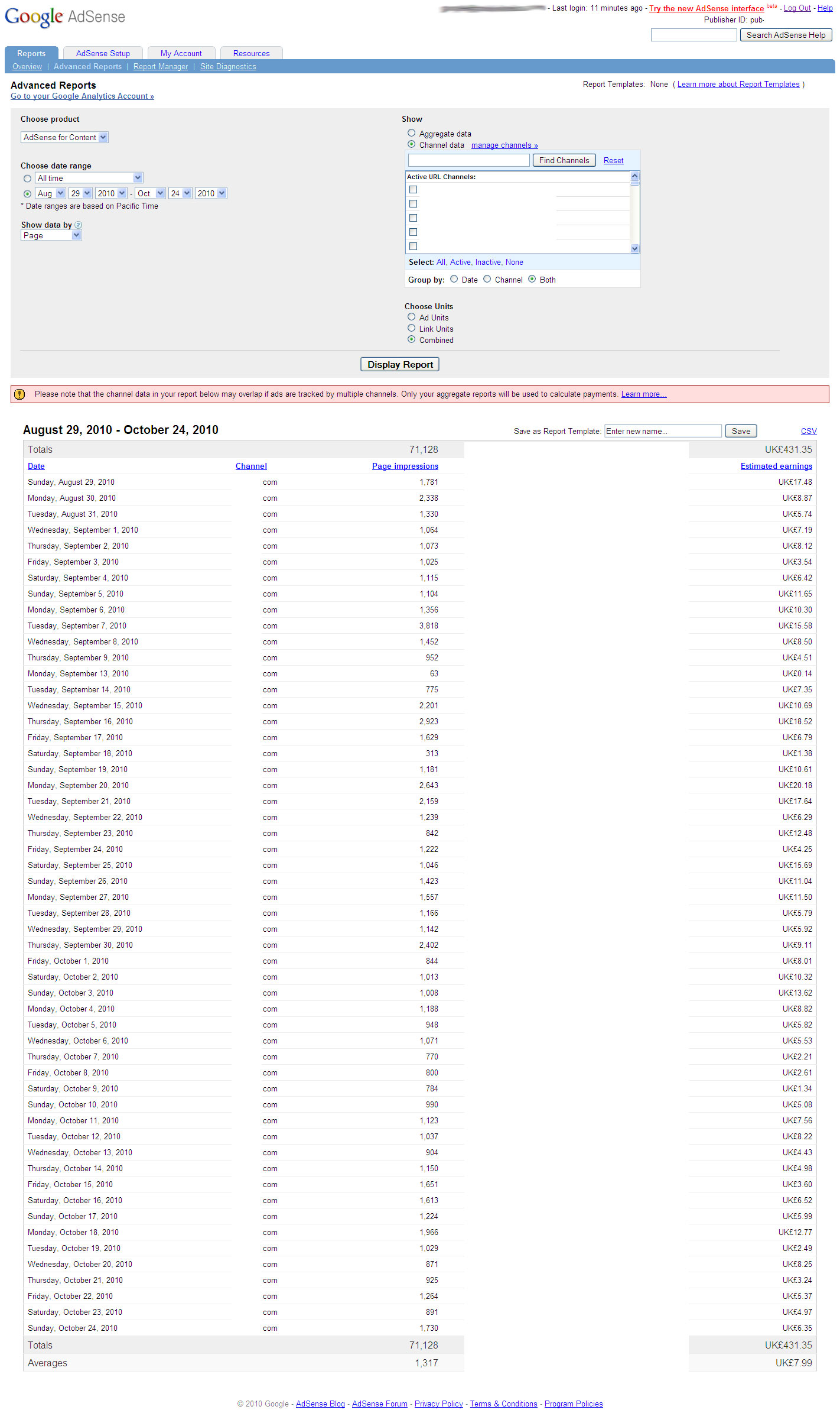 As you can see from the following screenshot, the site is earning around 8 pounds a day from adSense. This is approximately $12.58